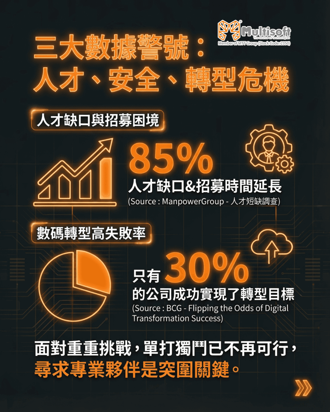 ⚠️ 轉型受阻:BCG 報告指出,僅有 30% 的企業能成功達成數碼轉型目標。