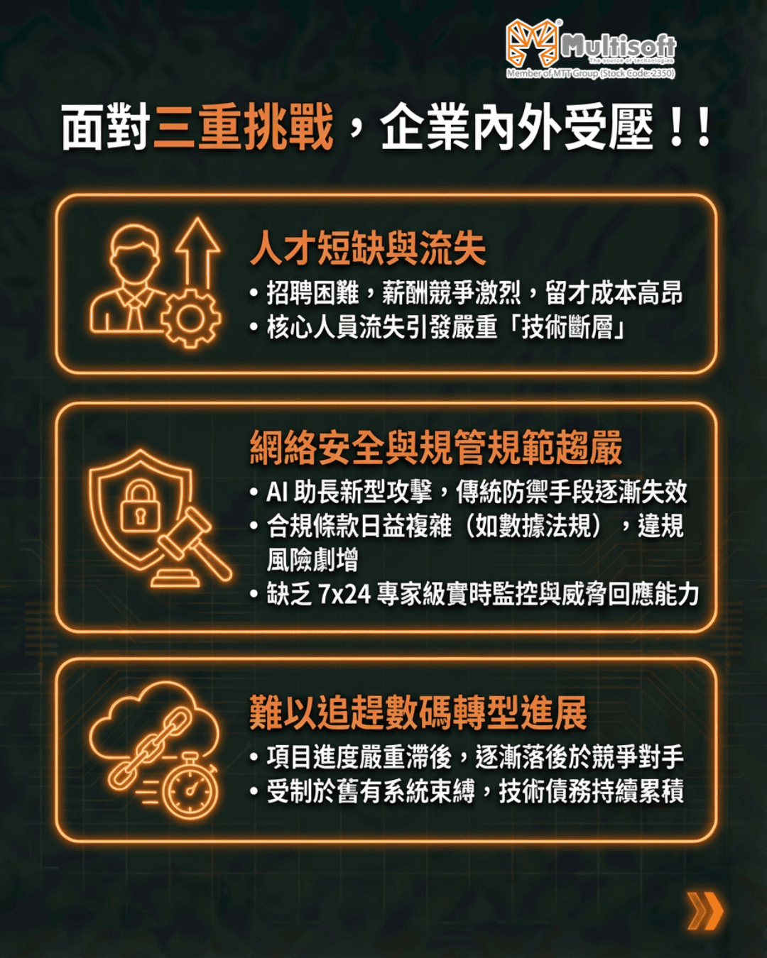 ❌ 網絡安全與規管趨嚴:AI 助長新型攻擊,加上合規條款如數據法規等日益複雜,缺乏 7x24 監控令違規風險劇增。