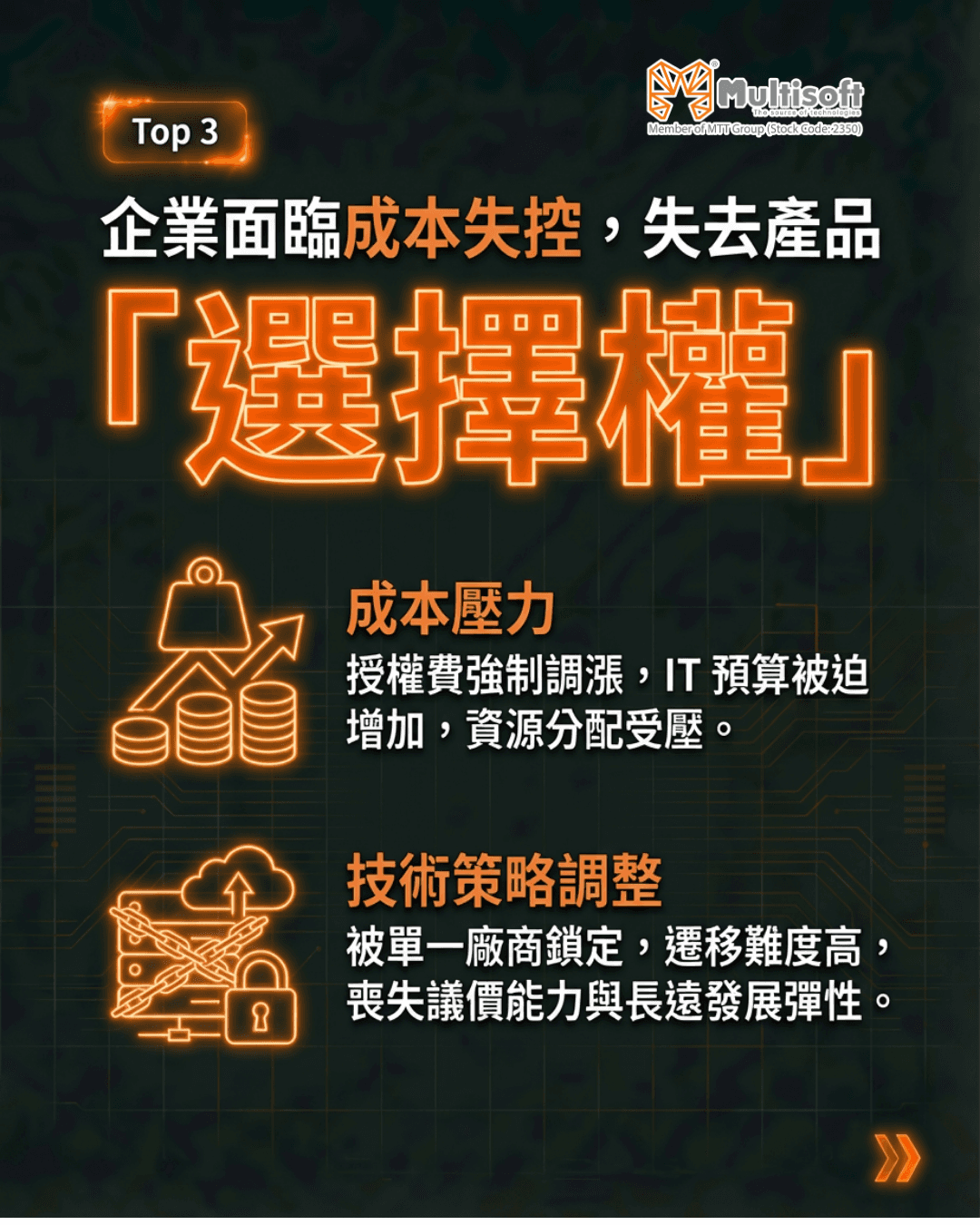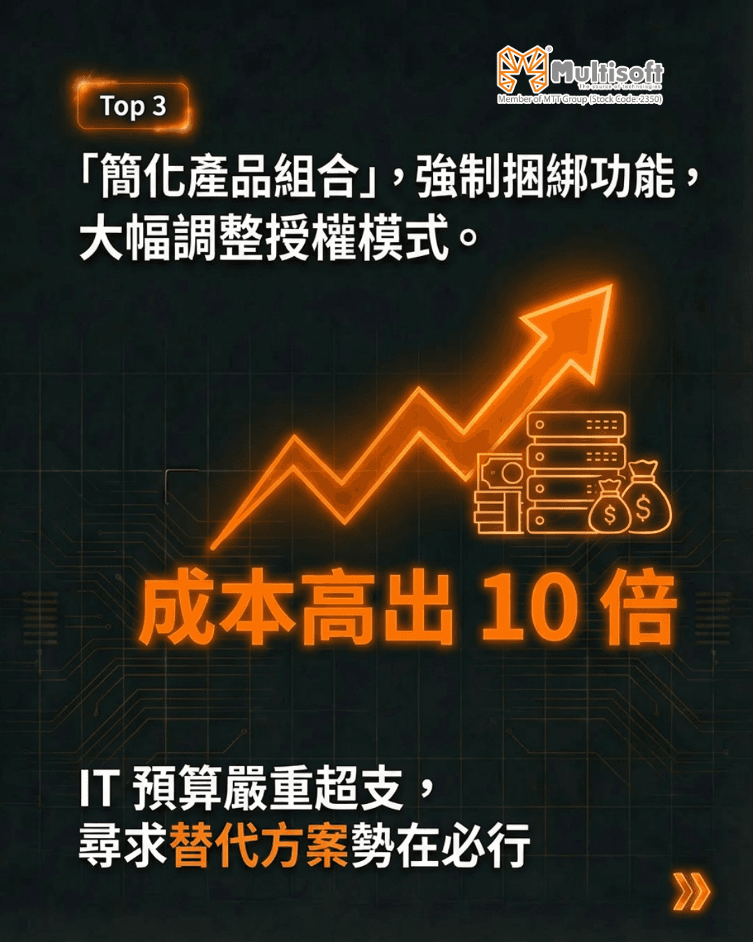 ❌ 成本壓力:授權費強制調漲,原本的 IT 預算被迫大幅增加,嚴重擠壓企業其他資源分配。