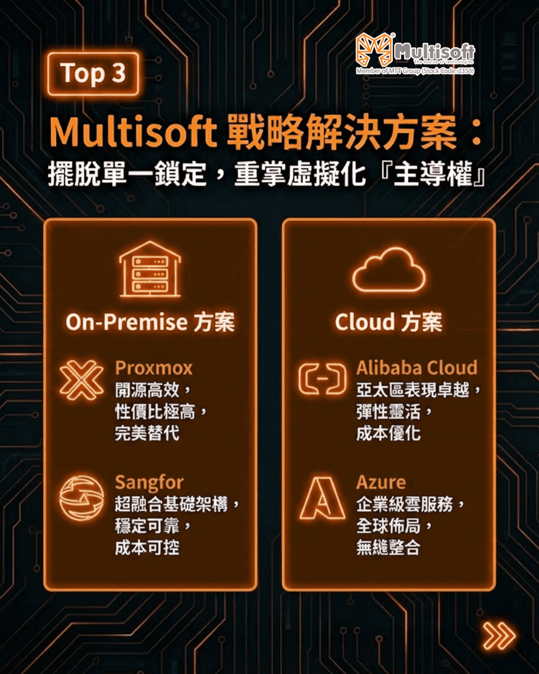 Multisoft 為你打破壟斷,擺脫單一鎖定,提供靈活的 On-Premise 與 Cloud 雙軌戰略,讓你重掌虛擬化「選擇權」。